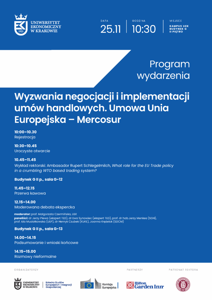 Serdecznie zapraszamy do wzięcia udziału w wydarzeniu „Wyzwania negocjacji i implementacji umów handlowych. Umowa Unia Europejska – Mercosur”.